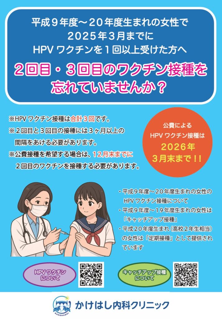 HPV(子宮頸がんワクチン)接種はお忘れでないでしょうか? 2025年12月10日 最終更新日時 : 2025年12月10日 kakehashi-naika 今年度の接種対象の方でまだ1回しか受けていない方は、2回目を今月までにしないと3回目が来年の3月に間に合わなくなります。 今月中に2回目を受けましょう 所沢市ホームページ HPV(ヒトパピローマワクチン)のページ